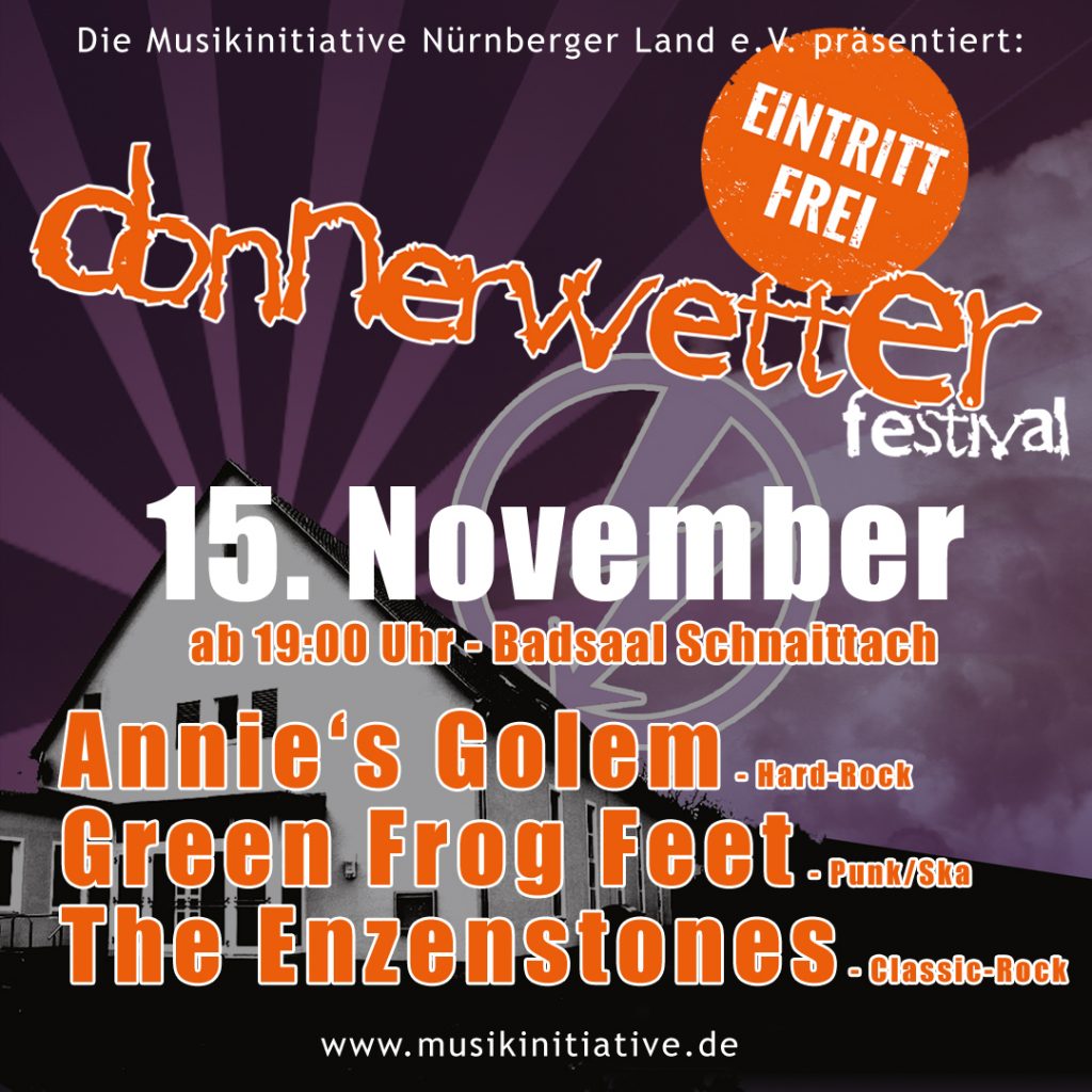 Dieses Jahr mit dabei „Annie’s Golem“ – Hard & Gringerock aus Schwabach, „Green Frog Feet“ – Punkrock aus Regensburg sowie die Lokalmatadoren „The Enzenstones“ – Classic Rock aus Schnaittach.